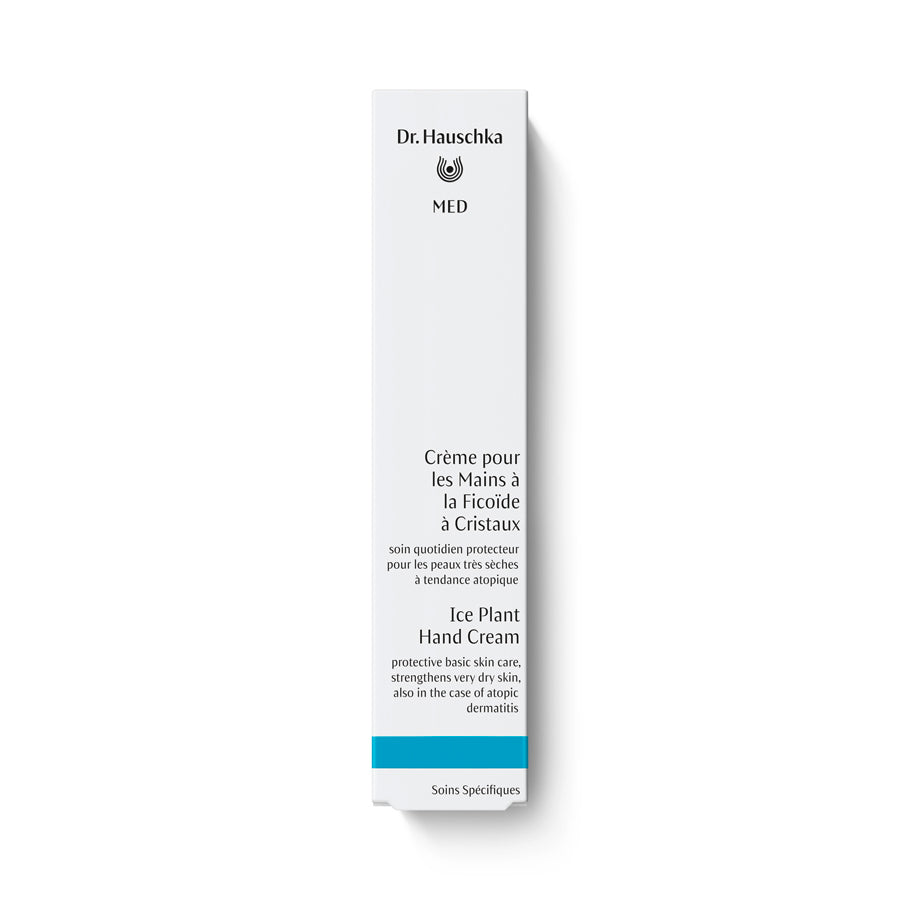 La Crème pour les Mains à la Ficoïde à Cristaux Dr. Hauschka MED a été spécialement développée pour répondre aux besoins des peaux très sèches, très sollicitées et ayant une tendance atopique. Elle prend intensément soin de la peau abîmée et craquelée qu’elle protège visiblement du dessèchement. Sa composition à base de jus pressé de ficoïde à cristaux hydratante adoucit sensiblement la sécheresse cutanée et réduit les sensations de tiraillement, tout en prévenant les démangeaisons. La peau rêche et desquamante des mains se sent immédiatement lisse et souple. L’association de beurre de mangue et de cires de myrte et de baies enveloppe l’épiderme pour renforcer sa barrière protectrice. Cette texture riche protège efficacement et durablement la peau. La Crème pour les Mains à la Ficoïde à Cristaux est volontairement sans parfum et convient également aux très jeunes enfants.