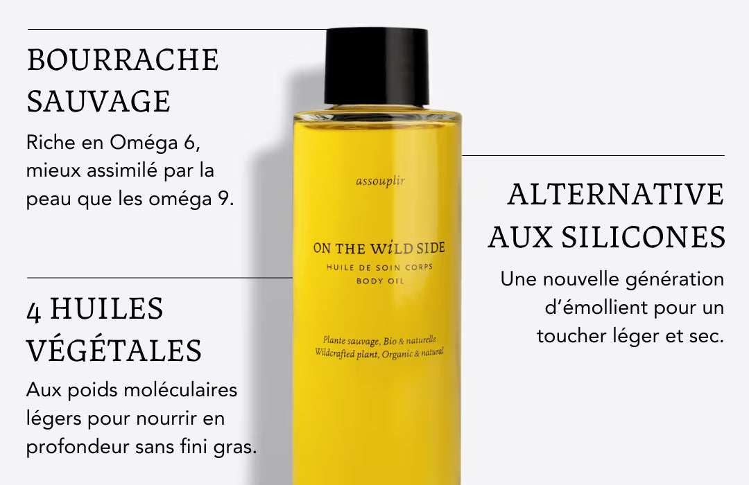 Composition irreprochable : un complexe d'Huiles végétales associé à la Bourrache riche en oméga 6, une plante sauvage aux vertus adoucissantes incroyables. Zéro silicone.